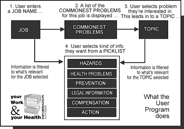 This information system was developed as a prototype in the mid-1990s, in conjunction with Sheffield Trade Union Studies Centre, based at Sheffield College. It was designed for educational purposes, for the general public and specifically for use on Health and Safety training courses. The user tells the computer what job they want to know about, and the computer provides them with information about the hazards and health problems most commonly associated with that job.